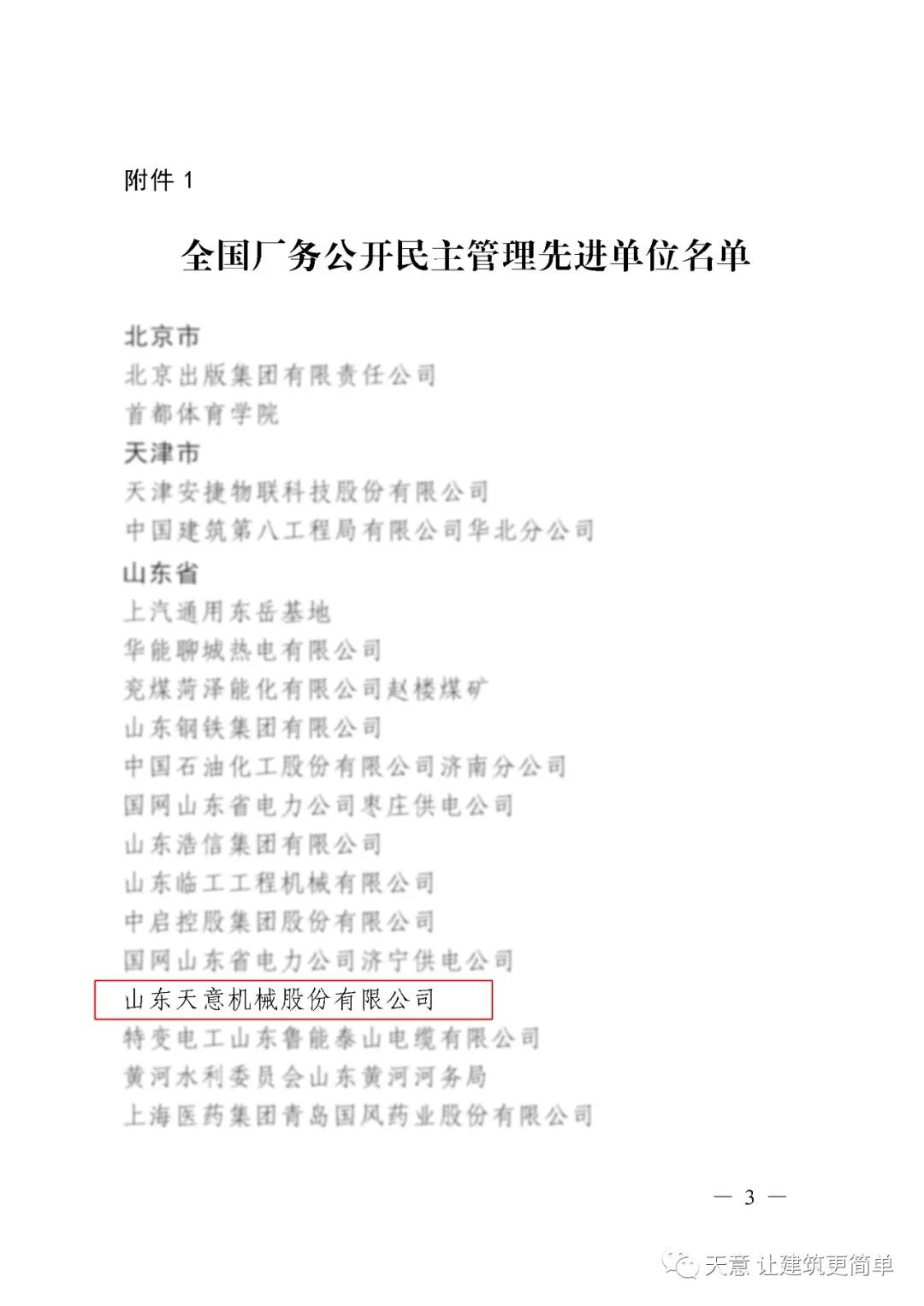 喜訊丨祝賀天意機械被授予“全國廠務公開民主管理先進單位”稱號