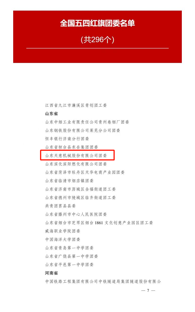 2023年是全面貫徹落實(shí)黨的二十大精神的開(kāi)局之年。近日,共青團(tuán)中央作出表彰決定,授予296個(gè)團(tuán)組織全國(guó)五四紅旗團(tuán)委稱號(hào);授予389個(gè)團(tuán)組織全國(guó)五四紅旗團(tuán)支部稱號(hào);授予481名同志(含追授1名)全國(guó)優(yōu)秀共青團(tuán)員稱號(hào);授予342名同志全國(guó)優(yōu)秀共青團(tuán)干部稱號(hào)。山東天意機(jī)械股份有限公司團(tuán)委榮獲全國(guó)五四紅旗團(tuán)委榮譽(yù)稱號(hào)。