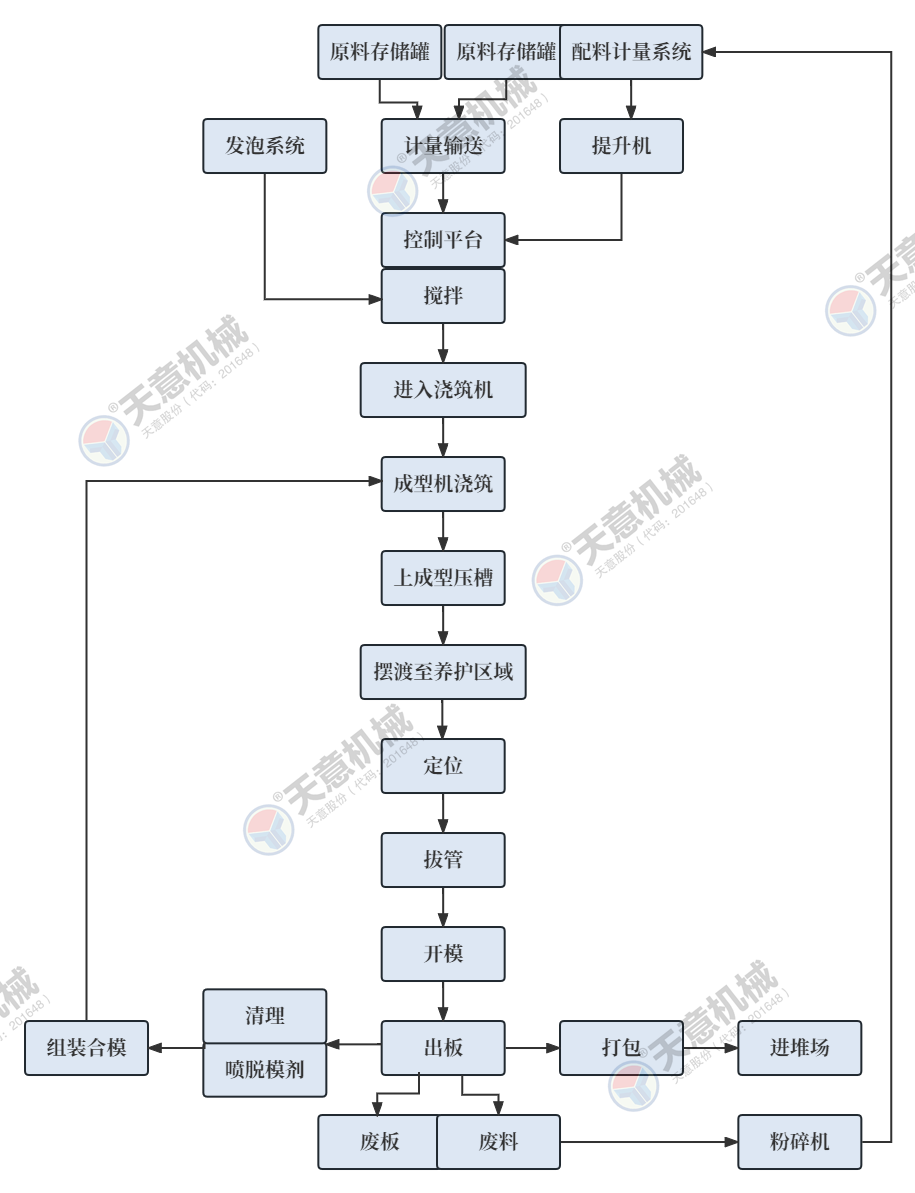 TY20型輕質(zhì)墻板生產(chǎn)線包括:墻板成型機、整體穿抽管系統(tǒng)、發(fā)泡系統(tǒng)、水箱、電子計量儲料倉、螺旋上料輸送機、儲料罐、螺旋輸送機、EPS熟化料倉、硫化干燥床、EPS預(yù)發(fā)機、數(shù)控配電室、發(fā)泡攪拌機、整體出板系統(tǒng)、叉車、成品堆放區(qū)、擺渡車。