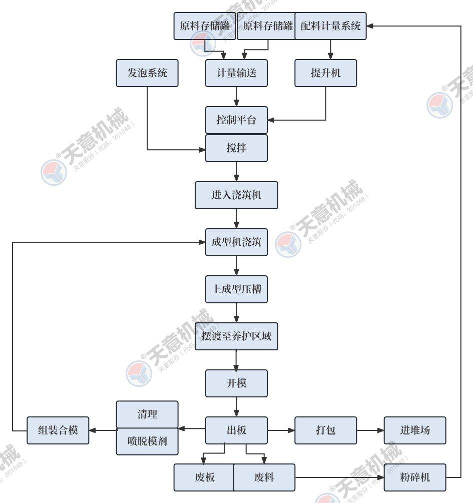 該復(fù)合墻板生產(chǎn)線采用立式旋轉(zhuǎn)臥式出板復(fù)合墻板成型機,一次可生產(chǎn)四十塊墻板,該生產(chǎn)線主要分為:配料攪拌系統(tǒng)、墻板成型系統(tǒng)、液壓整體開模系統(tǒng)、液壓翻轉(zhuǎn)系統(tǒng)、整體出板翻轉(zhuǎn)碼垛系統(tǒng)、成型機自動循環(huán)系統(tǒng)、變頻擺渡系統(tǒng)、數(shù)控配電系統(tǒng)等部件 組成。該生產(chǎn)線自動化程度高,液壓開合模,解決了傳統(tǒng)立式復(fù)合墻板機人工開合安全隱患,提高了工作效率。設(shè)備配有整體出板碼垛系統(tǒng),解決了傳統(tǒng)人工出板方式,減少產(chǎn)品的破損率,提高了產(chǎn)能。生產(chǎn)線使用密封式泵送系統(tǒng)配備雙工位注漿槍,注漿速度快密實度高,材料粘結(jié)更緊密。